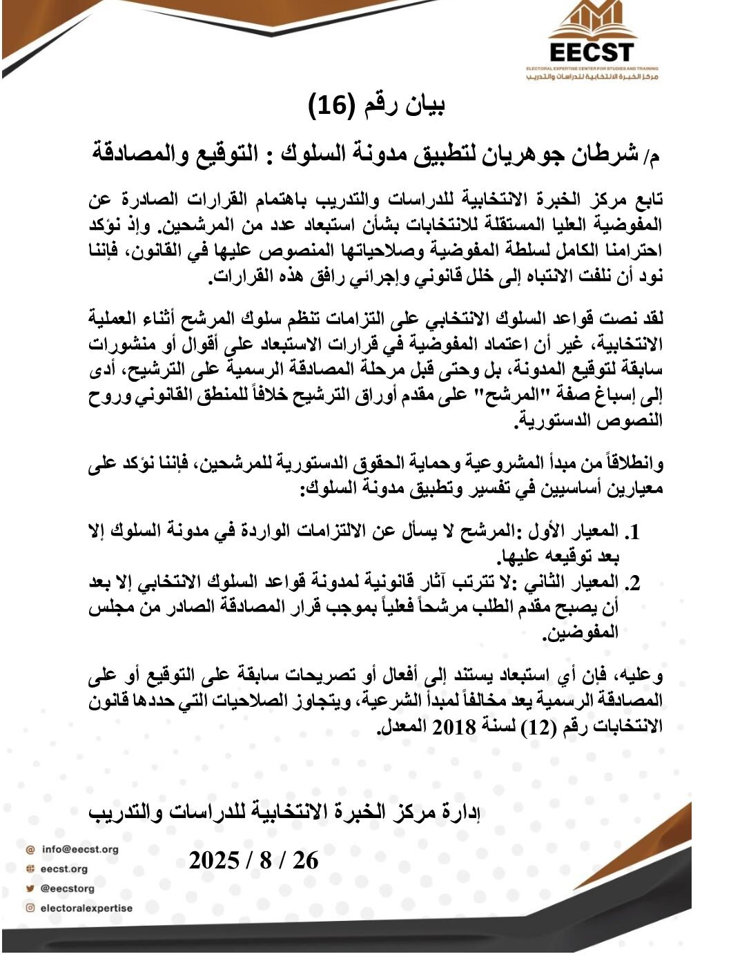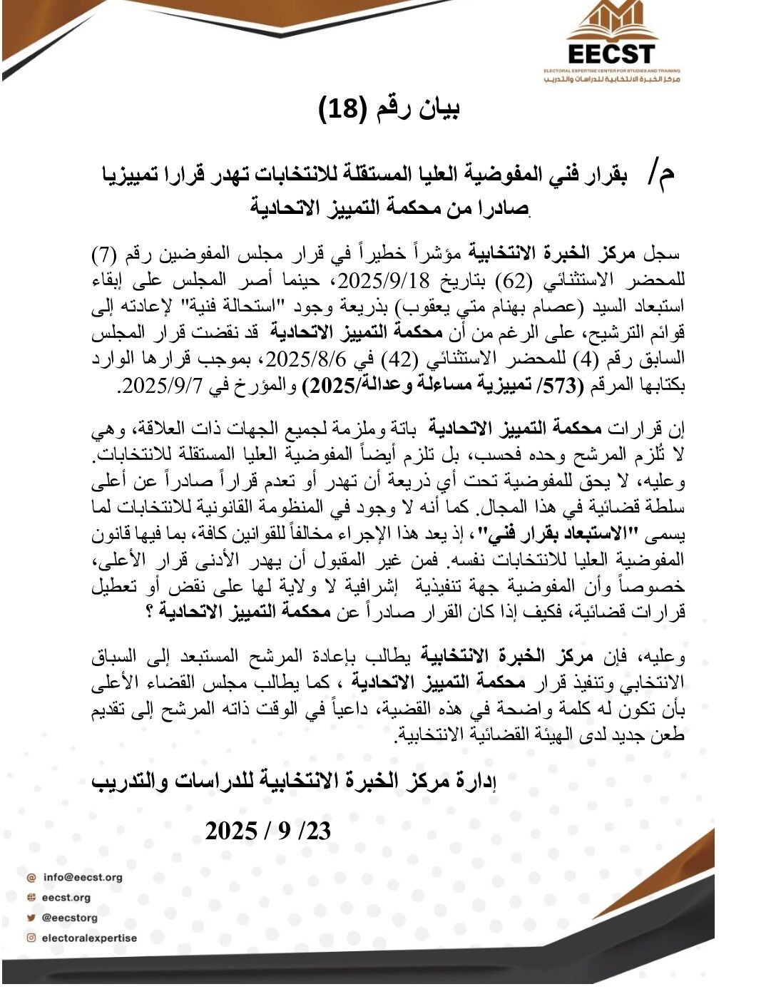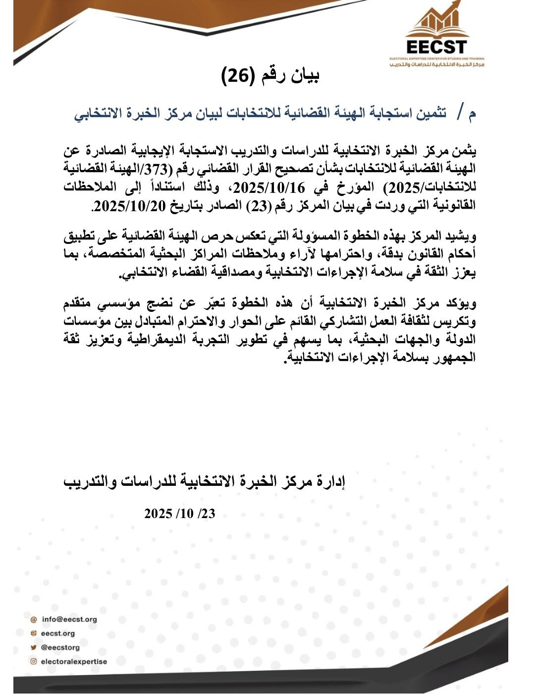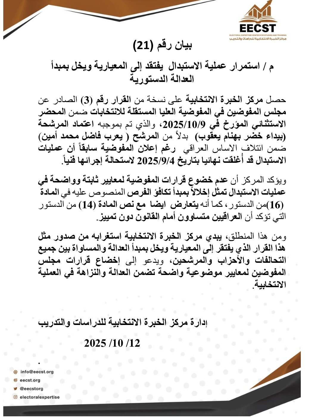 ِِ A statement has been issued by the Electoral Expetise Center of Studies regarding the defamation against female candidate for the 2025 Iraqi parliamentary election.